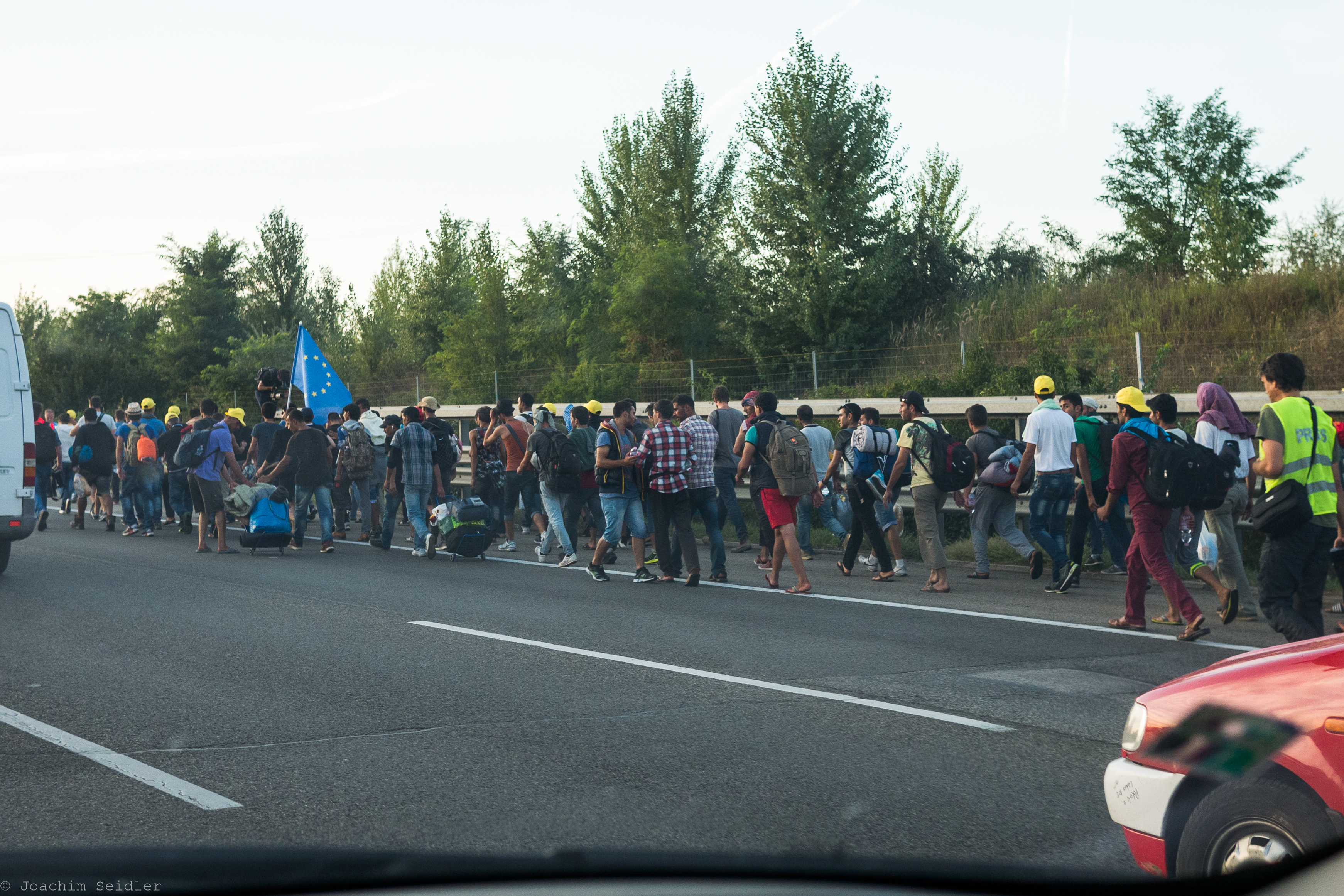 Flüchtlinge auf dem Seitenstreifen der ungarischen Autobahn M1 in Richtung Österreich, 4. September 2015