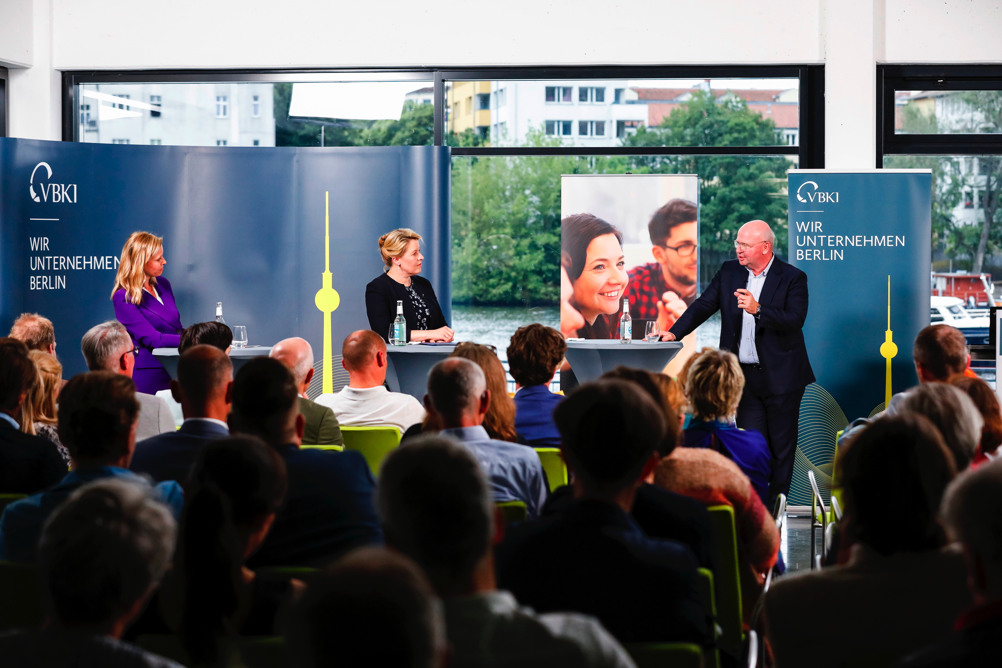 Franziska Giffey (Regierende Bürgermeisterin von Berlin, Bildmitte) und Markus Voigt (Präsident Verein Berliner Kaufleute und Industrieller, rechts) und Silke Beickert (rbb, links) Bild: VBKI Fotograf: Markus Stegner