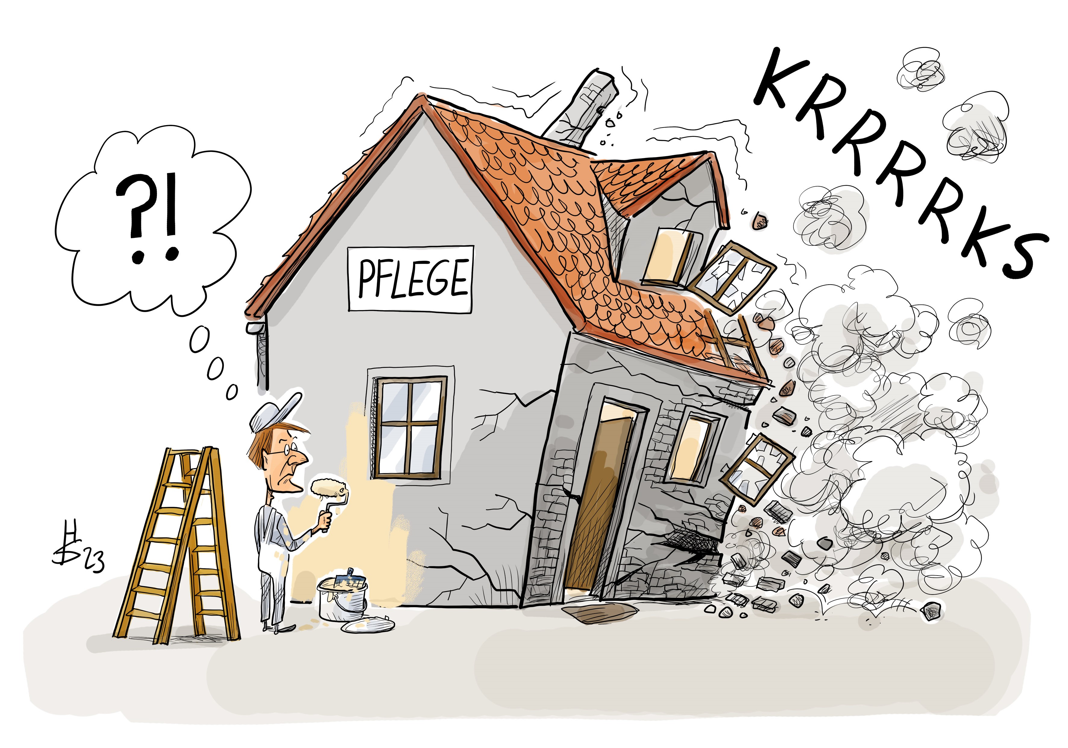 Das Gesamtgebäude der Pflege wankt bedrohlich, aber der Minister steht selbstzufrieden mit seinem kleinen Farbeimerchen davor, und feiert einen Fassadenanstrich als große Reform. Bildrechte: bpa - Bundesverband privater Anbieter sozialer Dienste e.V. Fotograf: Heiko Sakurai