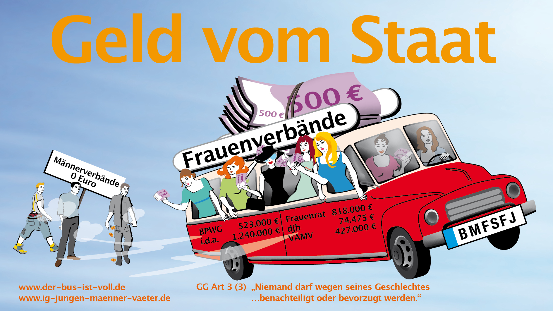 Geld nur für Frauenverbände - IG-JMV - 23.08.2019. Bild: "obs/Interessengemeinschaft Jungen, Männer und Väter (IG JMV)/IG-JMV"