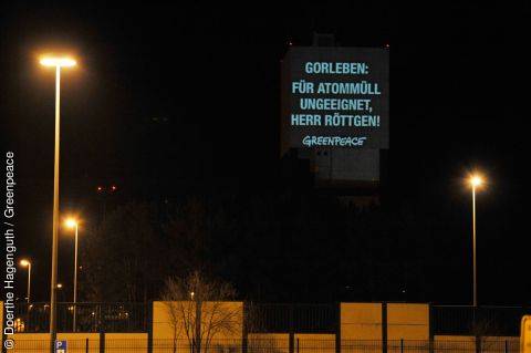 Greenpeace-Aktivisten projizieren ihren Protest gegen die geplante weitere Erkundung des Salzstocks Gorleben auf den Förderturm. Bild: Doerthe Hagenguth / Greenpeace