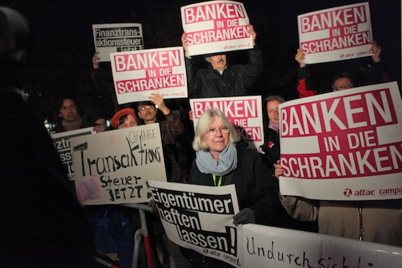 Zurück zu Demonstranten fordern vor dem Bundestag: Großbanken aufspalten! / Campact und Attac entrollen 15 Meter langes Banner vor dem Reichstag: "Banken in die Schranken"