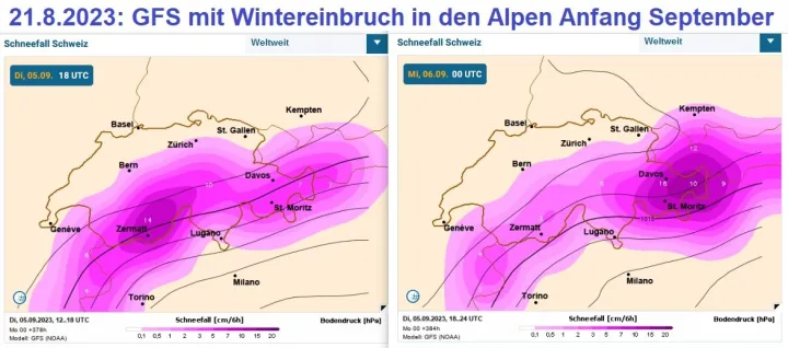 Zum Vergrößern anklicken. GFS rechnet am 21.8.2023 mit einem massiven Wintereinbruch in den Alpen um den 5.9.2023. Dabei soll es vor allem in der Schweiz und in Österreich oberhalb von etwa 1500m kräftig schneien und bis zu einem halben Meter Neuschnee geben. Bild: WO/GFS-Prognosen Schneefall Schweiz