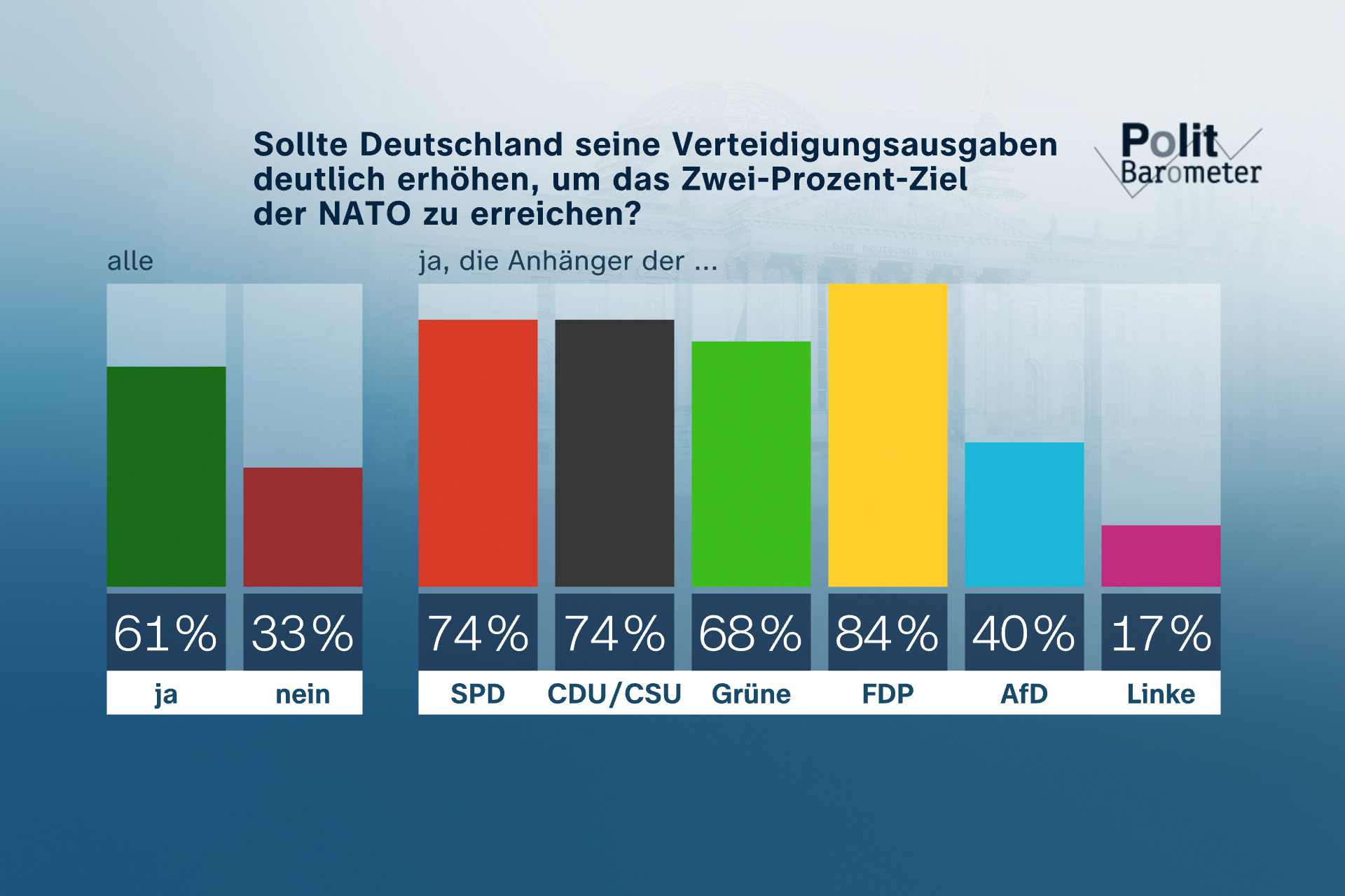 Zurück zu Klare Mehrheit für deutlich höhere Verteidigungsausgaben Regierung wird als zerstritten wahrgenommen – AfD weiter auf Höhenflug