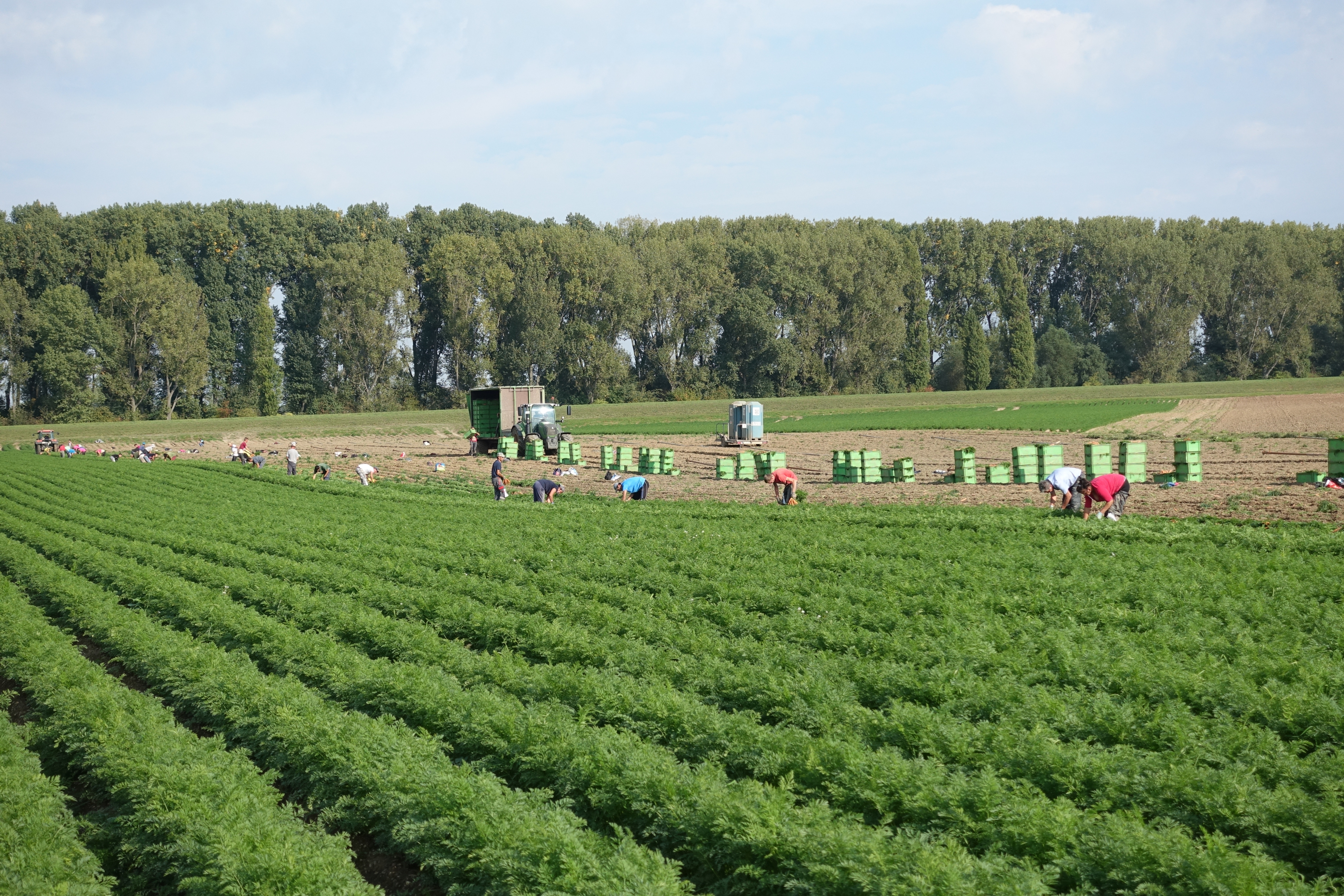 Osteuropäische Erntehelfer bei der Ernte von Karotten, nahe Frankenthal.