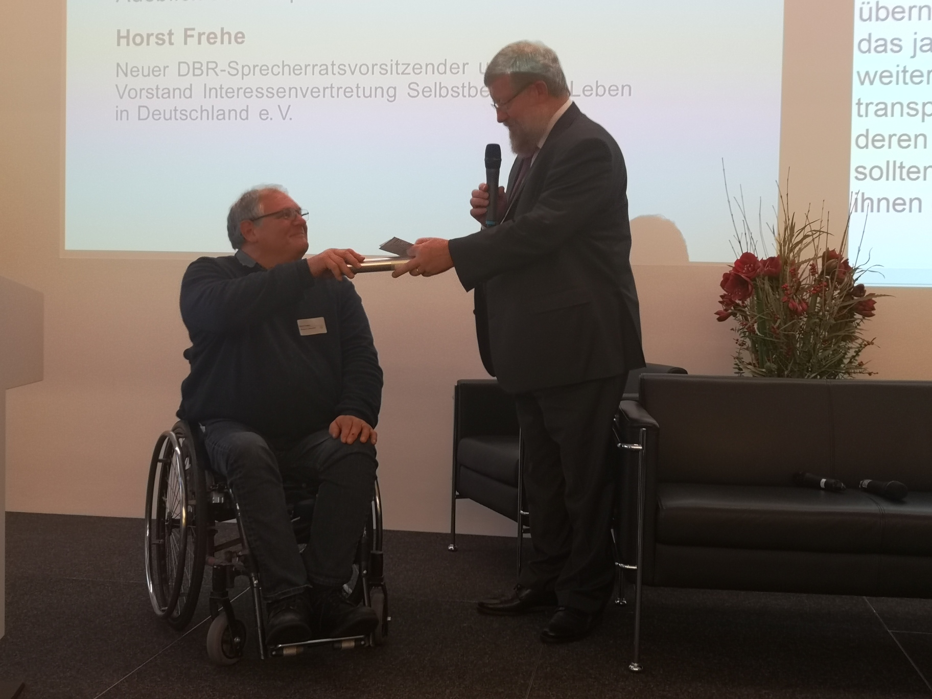 SoVD-Präsident Adolf Bauer reicht den DBR-Staffelstab an Horst Frehe (Vorstand Interessenvertretung Selbstbestimmt Leben in Deutschland e.V.) Bild: "obs/Deutscher Behindertenrat (DBR)"