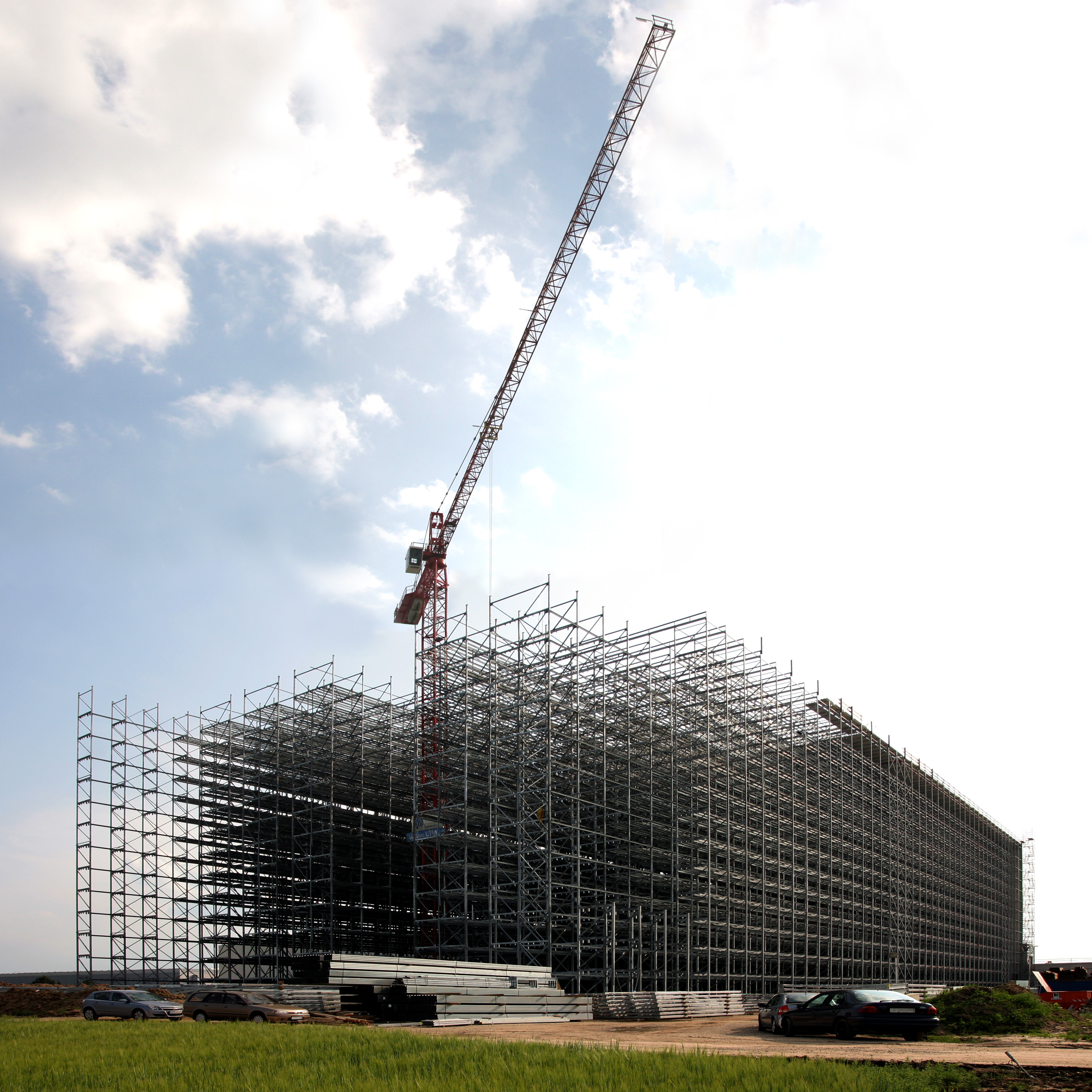Das Hochregallager im Distributionszentrum Biebesheim am Rhein mit 55.000 Stellplätzen für Europaletten während der Bauphase.[3]