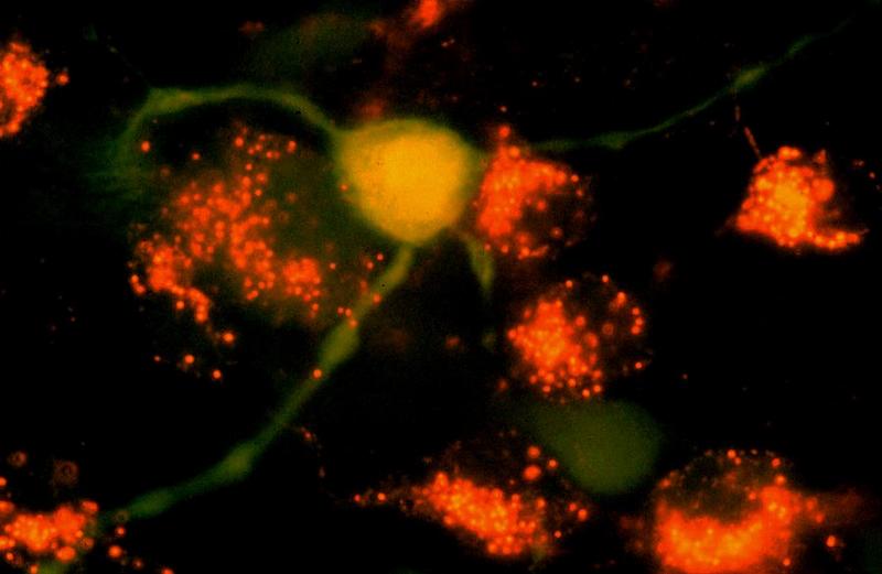 Aufsicht auf die Netzhaut einer Ratte: Nervenzelle mit eingeschleustem grünfluoreszierendem Gen einer Tiefseequalle (Aquorea Victoria). UKT, Dr. Perikles Simon