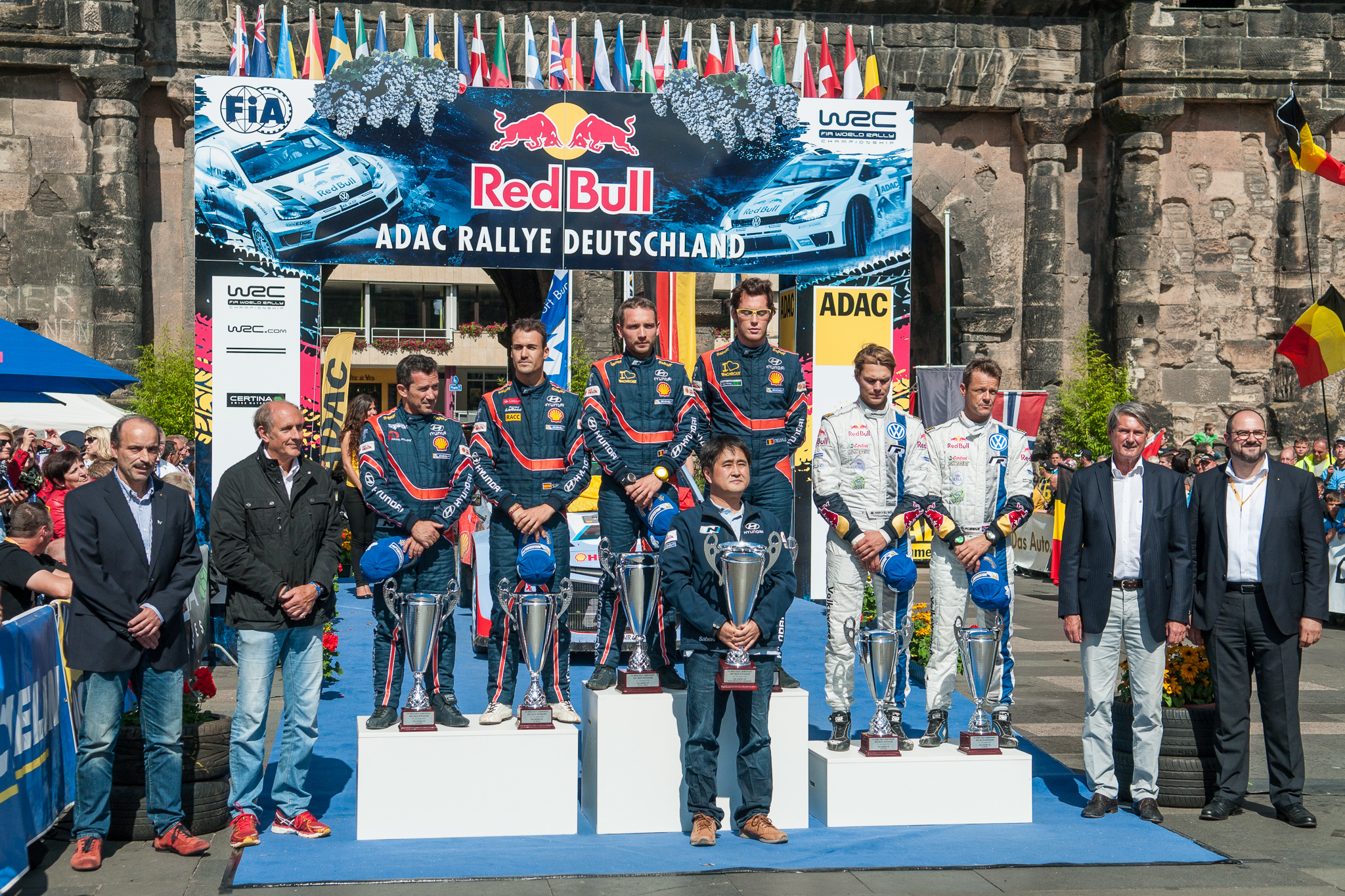 ADAC Rallye Deutschland 2014,Andreas Mikkelsen,Dani Sordo,FIA,FIA World Rally Championship,Hans-Joachim Stuck,Hermann Tomczyk, Hyundai Motorsport, Marc Marti,Motorsport, Nicolas Gilsoul, Ola Floene, Rally Rallye, Siegerehrung,Strietzel Stuck, Thierry Neuville, Volkswagen Motorsport, WRC (2014), Archivbild