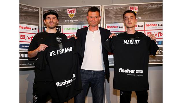 eSports-Spieler Erhan "Dr. Erhano" Kayman und Marcel "Marlut" Lutz (v.l.n.r.) zusammen mit VfB-Marketing-Vorstand Jochen Röttgermann (Mitte).