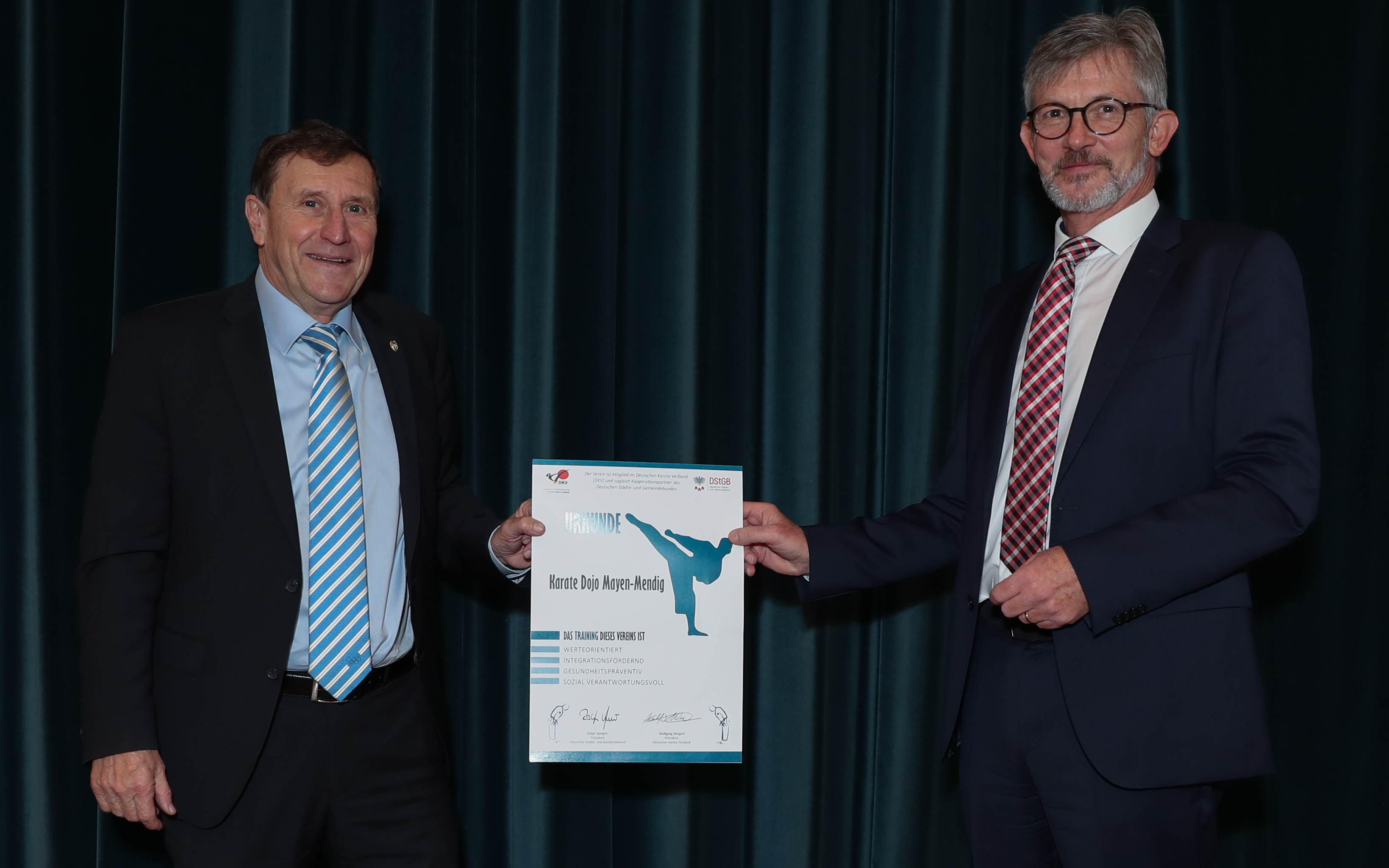 DKV-Präsident Wolfgang Weigert (links) und der Präsident des Deutschen Städte- und Gemeindebundes, Ralph Spiegler, ratifizierten die Zusammenarbeit. / Bild: "obs/Deutscher Karate Verband/DKV / Brigitte Kraußer"