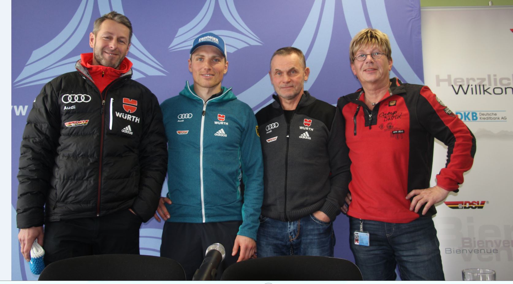 vl. Biathlonbundestrainer: Mark Kirchner, Biathlet: Erik Lesser, Biathlonbundestrainer Gerald Hönig, Fotojournalist ExtremNews Karl Koch Bild: Eva Riedemann - ExtremNews