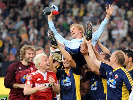 Oliver Pocher als Oliver Kahn wird von den McFit Allstars nach dem Spiel gegen den FC Bayern München gefeiert. Bild: obs/McFit GmbH