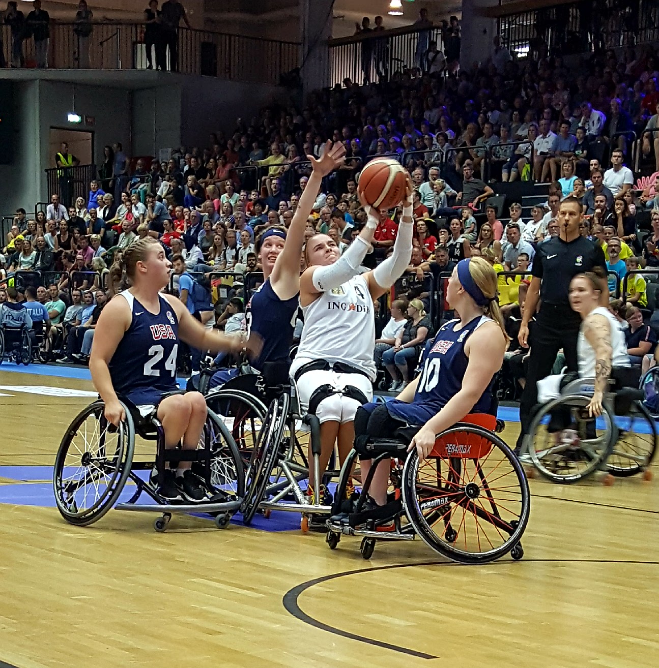 Sportlerinnen bei der Rollstuhlbasketball-WM 2018 in Hamburg.
