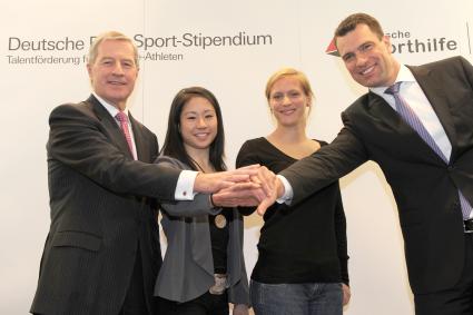 Auf dem Bild (v.l.): Jürgen Fitschen, Kim Bui (Turnen), Verena Sailer (Leichtathletik), Dr. Michael Ilgner. Bild: "obs/Stiftung Deutsche Sporthilfe"