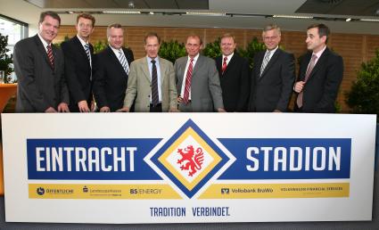 In Eintracht für das Eintracht-Stadion (v.l.n.r.): Knud Maywald (Öffentliche Versicherung, Vorstand), Dr. Christian Dahlheim (Volkswagen Financial Services AG, Leiter Unternehmensentwicklung und Kommunikation), Uwe Birker (Geschäftsführer Stadthallen GmbH), Dr. Gert Hoffmann (Stadt Braunschweig, Oberbürgermeister), Sebastian Ebel (Eintracht Braunschweig, Präsident), Jürgen Brinkmann (Volksbank eG Braunschweig Wolfsburg, Vorstandssprecher), Christoph Schulz (Braunschweigische Landessparkasse, Vorstandsvorsitzender) und Francis Kleitz (BS Energy, Finanzvorstand). Bild: "obs/Eintracht-Stadion"