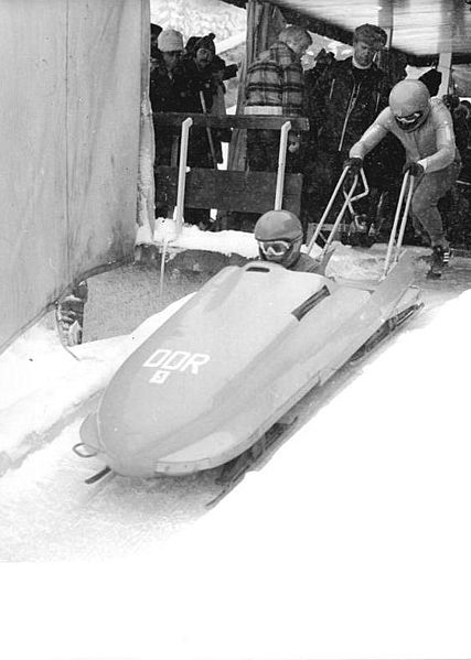 Bei der DDR-Meisterschaft 1979 schiebt Andreas Kirchner den Bob von Horst Schönau an. Bild: Helmut Schaar / Deutsches Bundesarchiv (German Federal Archive), Bild 183-U0331-0025