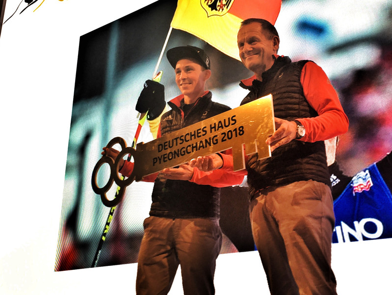 DOSB-Präsident Alfons Hörmann übergibt Fahnenträger Eric Frenzel symbolisch den Schlüssel fürs Deutsche Haus in PyeongChang. Bild: DOSB