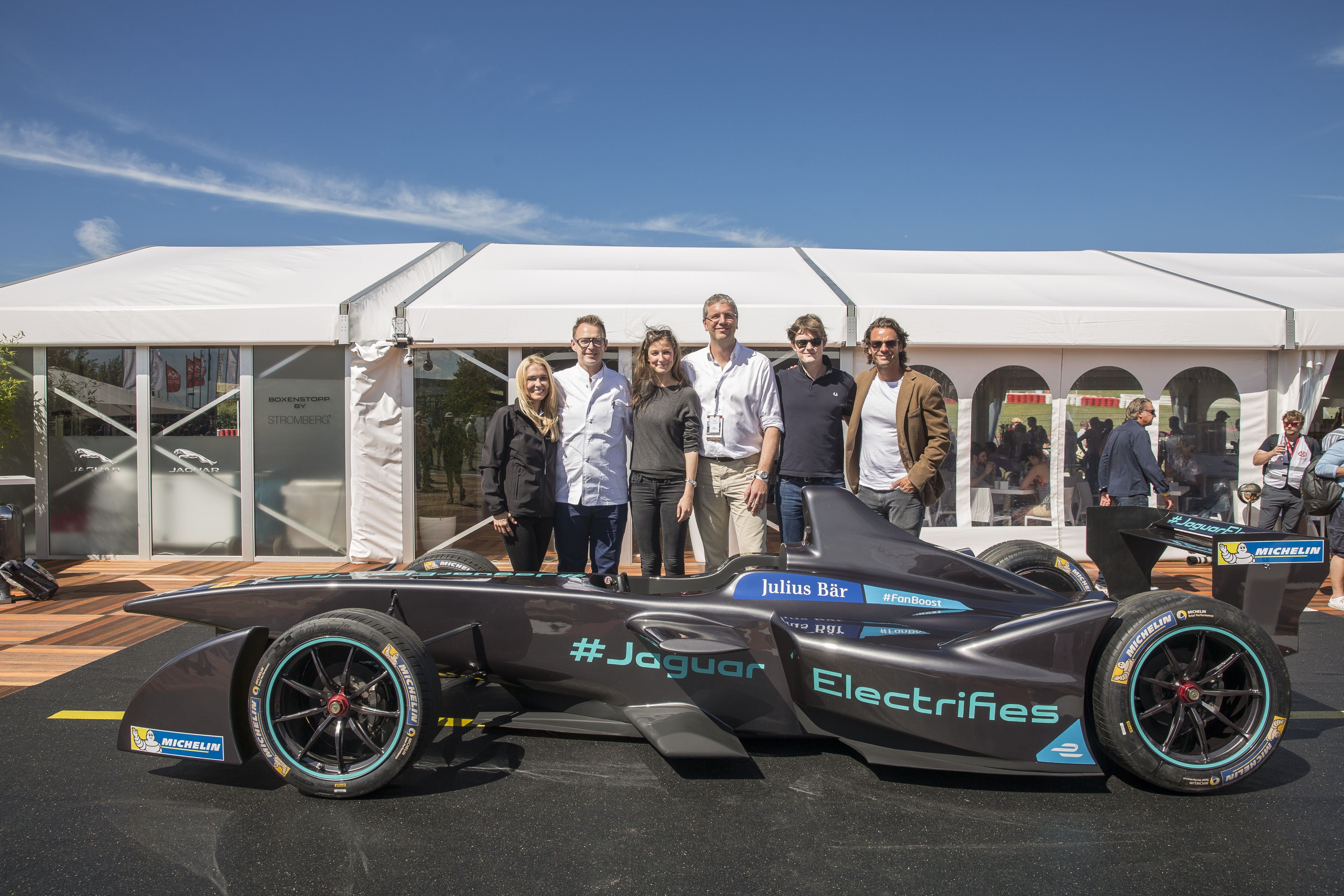 Prominente Gäste, automobile Stars von gestern, heute und morgen und heiße Action bei der Jaguar Challenge: Jaguar Land Rover begeistert beim 44. AvD Oldtimer-Grand-Prix / Jaguar Land Rover beim AvD Oldtimer-Grand-Prix 2016 am Nürburgring: (v.l.n.r.) Moderatorin Petra Bindl, Star-Koch Holger Stromberg, Schauspielerin Alexandra Maria Lara, Jaguar Land Rover Deutschland Geschäftsführer Peter Modelhart, die Schauspieler Sam Riley und Stephan Luca. Bild: "obs/Jaguar Land Rover Deutschland GmbH/M. Nass für Jaguar Land Rover"