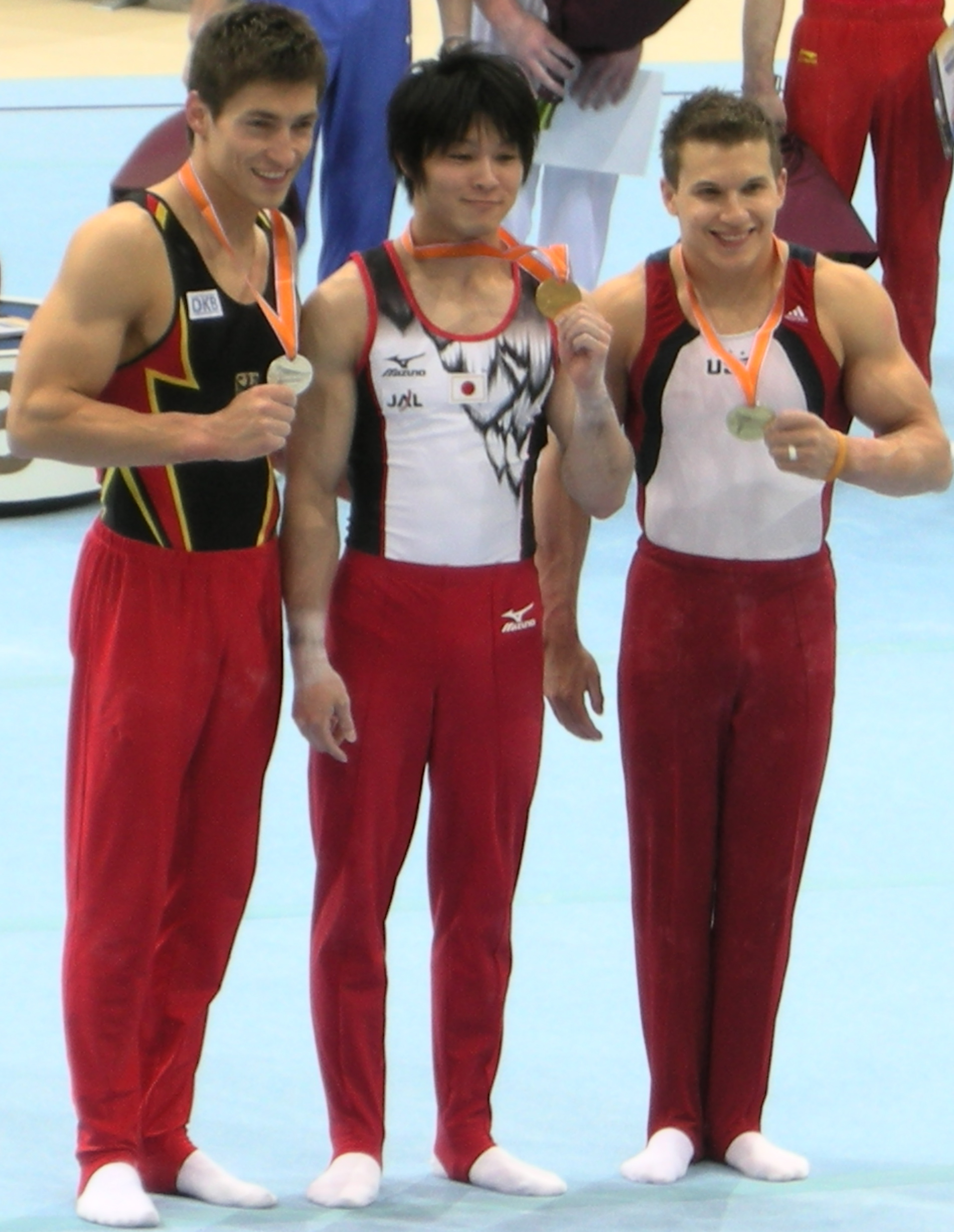 Philipp Boy (links) bei der WM 2010 mit Weltmeister Kōhei Uchimura und Bronzemedaillengewinner Jonathan Horton (USA)