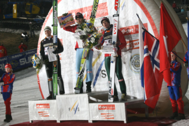 Siegerehrung: Platz 1: Romören (Norwegen) 142,0 m + 147,5 m, Platz 2: Damjan (Slowenien) 143,0 m + 143,5 m, Platz 3: Bardal (Norwegen) 142,0 m + 143,5 m Bild: ExtremNews / Karl Koch