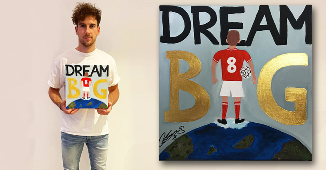 EM-Held Leon Goretzka versteigert sein selbstgemaltes Bild "DREAM BIG" beim Charity-Auktionsportal United Charity Bild: United Charity gemeinnützige Stiftungs GmbH Fotograf: Wünschewagen Niedersachsen