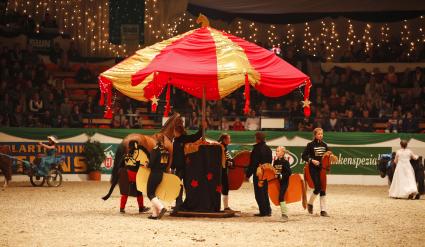 VR Classics 2012: Das Zauberkarussell inszenierten die Struvenhüttener mit acht Reitern, 2 Sulkys und zehn Akteuren zu Fuss und zwar so überzeugend, dass die Jury im von der Sparkasse Südholstein präsentierten Wettbewerb "Bestnoten" zückte. Bild: "obs/Comtainment GmbH" PST Paul Schockemöhle Marketing GmbH und Thomas Hellmann
