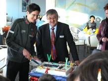 Martin Schmitt und Volker Slovek beim Anschneiden der Geburtstagstorte. Bild: SCW