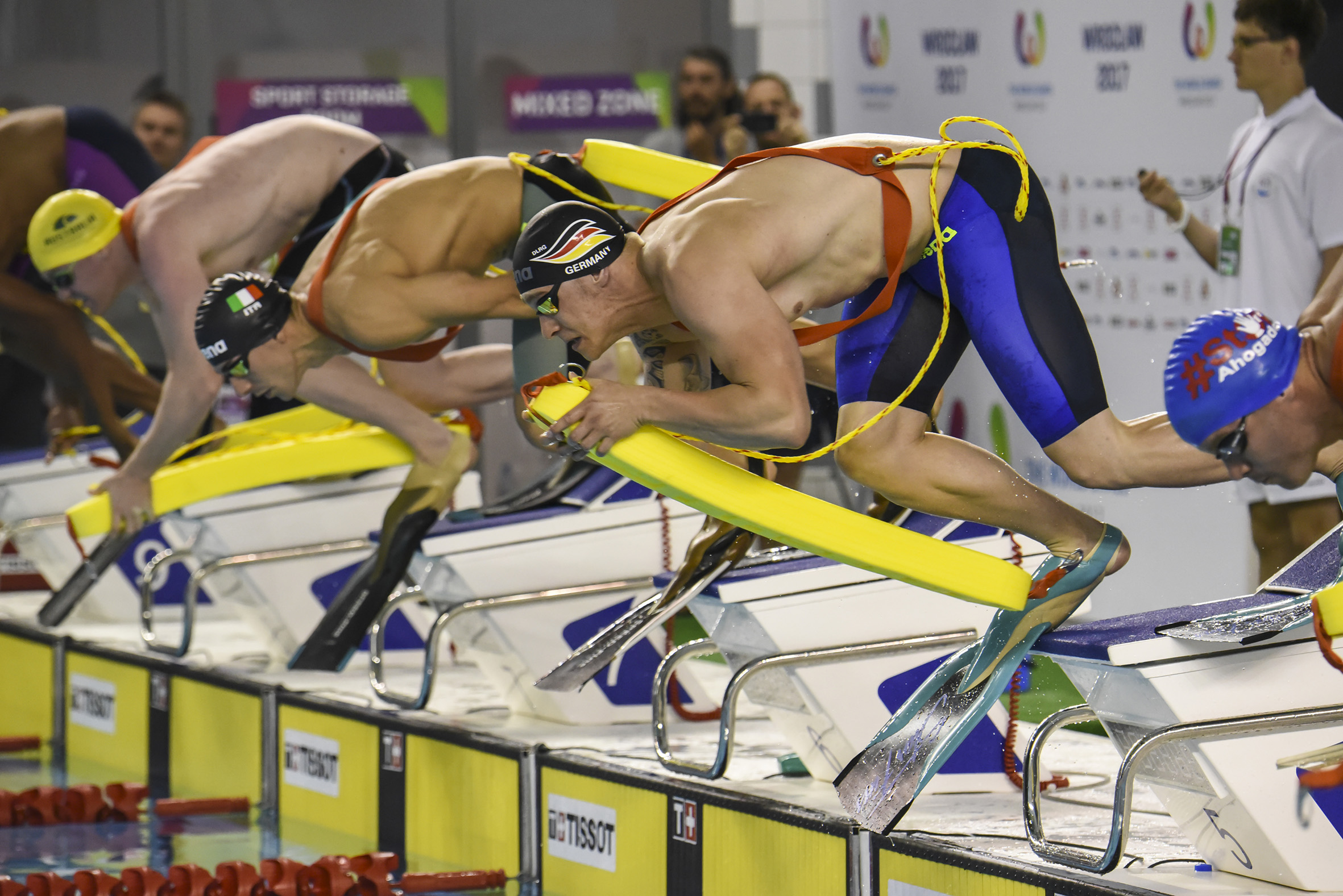 World Games in Breslau: DLRG-Rettungsschwimmer im Medaillenrausch / Kevin Lehr von der DLRG Stralsund startet in die Gurtretterstaffel. Bild: "obs/DLRG - Deutsche Lebens-Rettungs-Gesellschaft/DLRG/Denis Foemer"