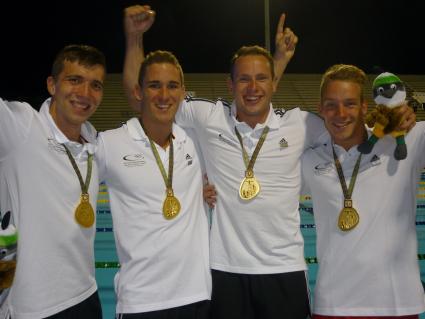 Die siegreiche 4x50m Hindernisstaffel der Herren mit Christian Ertel, Marcel Hassemeier, Danny Wieck und Adrian Flügel (v.l.n.r.). Bild: "obs/DLRG - Deutsche Lebens-Rettungs-Gesellschaft"