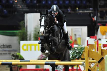 Der Schweizer Reitprofi Manfred Mueller hat mit Cheenoks Boy das erste internationale Springen bei der Baltic Horse Show in der Kieler Sparkassen-Arena gewonnen. Bild: Karl-Heinz Frieler