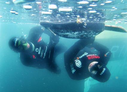 Andreas Güldner (rechts) im Kampf um den Puck bei der Unterwasser- Eishockey-Weltmeisterschaft im österreichischen Kärnten.