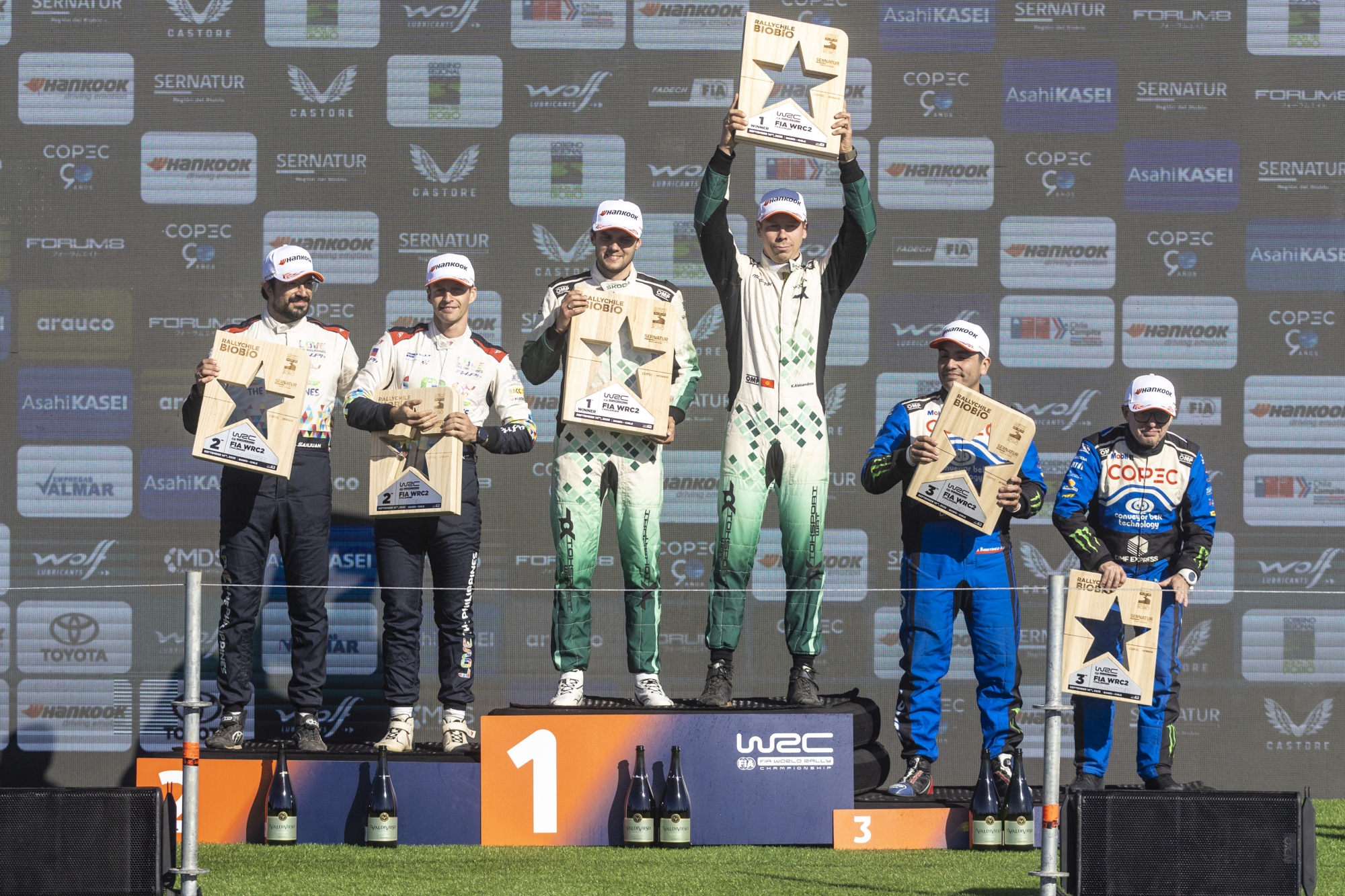 Podium der WRC2 Challenger mit den Skoda Teams Nikolay Gryazin/Konstantin Aleksandrov (mitte) und Jorge Martínez Fontena/Rubén García (rechts). (2025) Bild: Skoda Auto Fotograf: Skoda Auto Deutschland GmbH