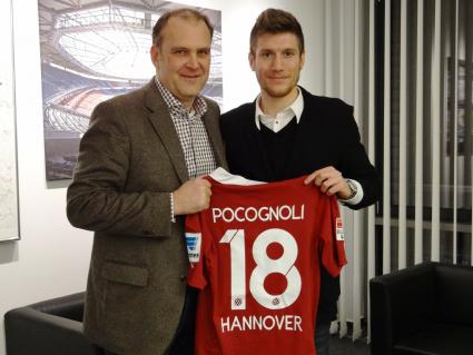 Jörg Schmadtke (Geschäftsführer Sport) und Sébastien Pocognoli. Bild:: "obs/Hannover 96 GmbH & Co. KGaA"