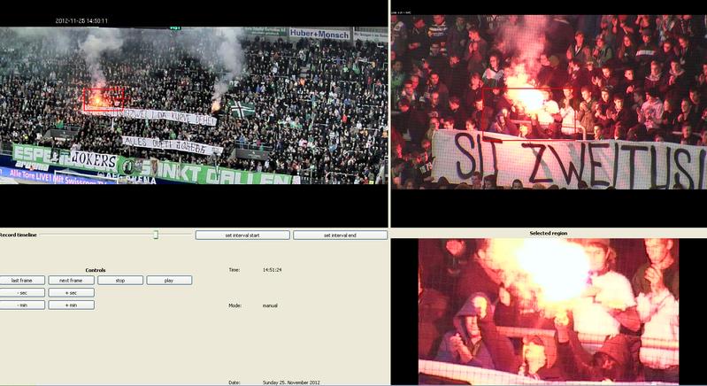 Vigilant Eye System mit einer aktiven Dome-Kamera: Oben rechts das Übersichtsbild, oben links das Bild der aktiven Kamera, unten der oben rechts markierte Ausschnitt im Digitalzoom, der die Identifikation von Personen erlaubt. Quelle: Foto: Fraunhofer FIT (idw)