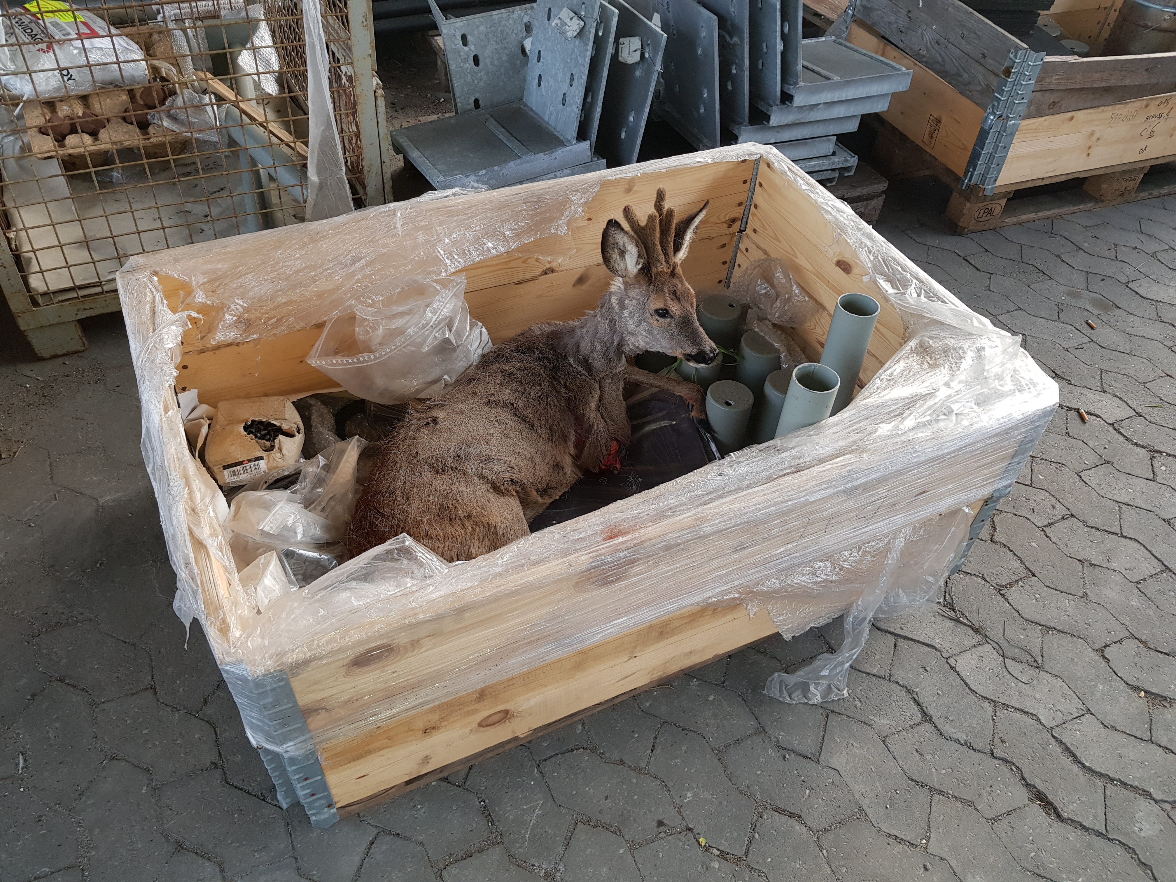 Zurück zu A67: Nach Wildunfall Reh regeneriert sich in Transportkiste der Autobahnbaustelle