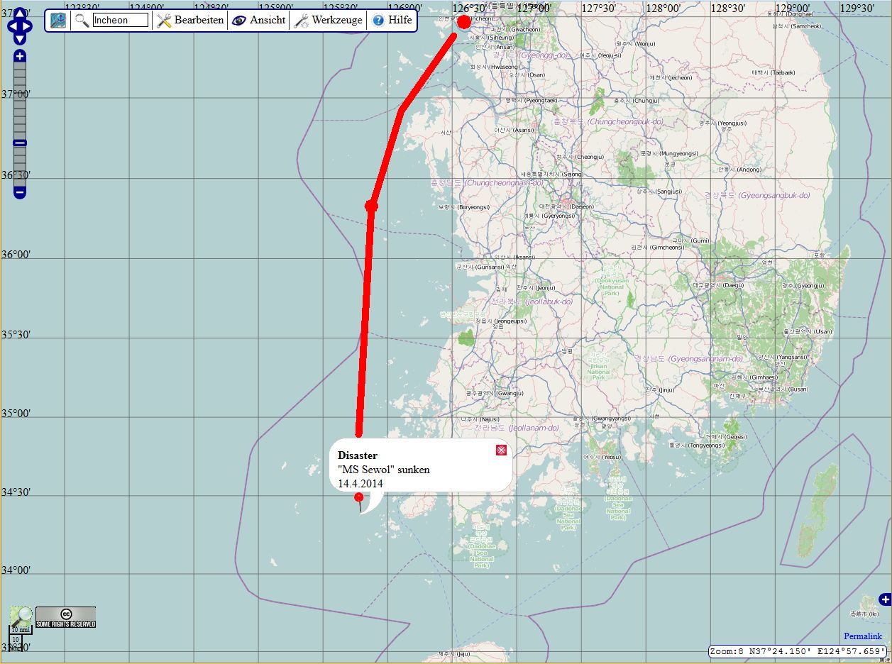 Karte mit Position der Unglücksstelle. Die Sewol war ein RoRo-Fährschiff, das am 16. April 2014 auf seinem Weg von Incheon nach Jejudo auf Höhe der Insel Jindo im Gelben Meer mit 476 Menschen an Bord kenterte..
