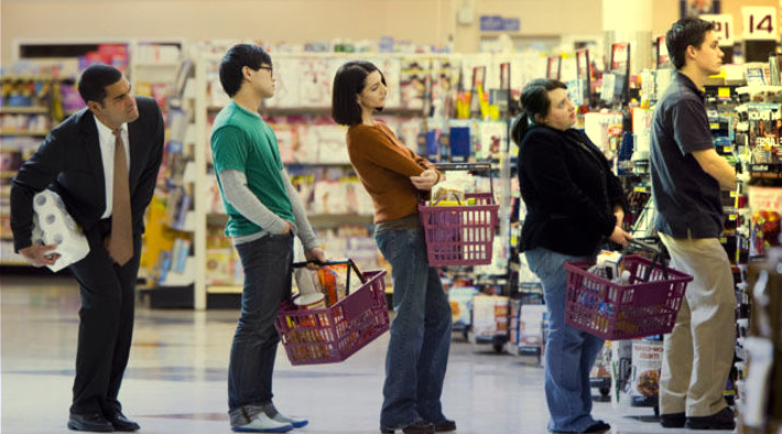 Eine typisch "diskrete" Schlange vor der Kasse im Supermarkt (Symbolbild)