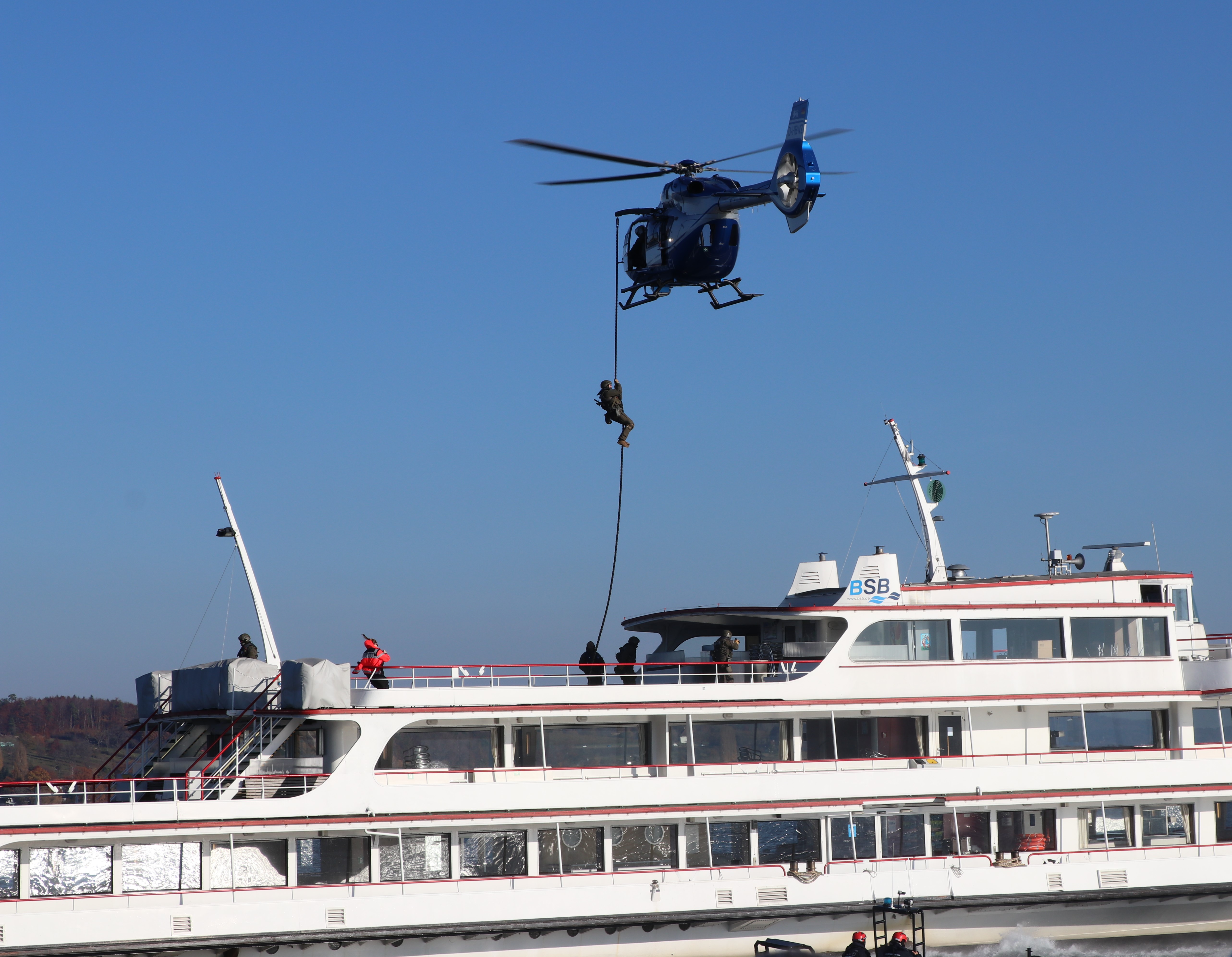 Ein SEK-Beamter gleitet am Tau vom H 145 der Polizeihubschrauberstaffel auf das Fahrgastschiff ab. Bild: Polizei