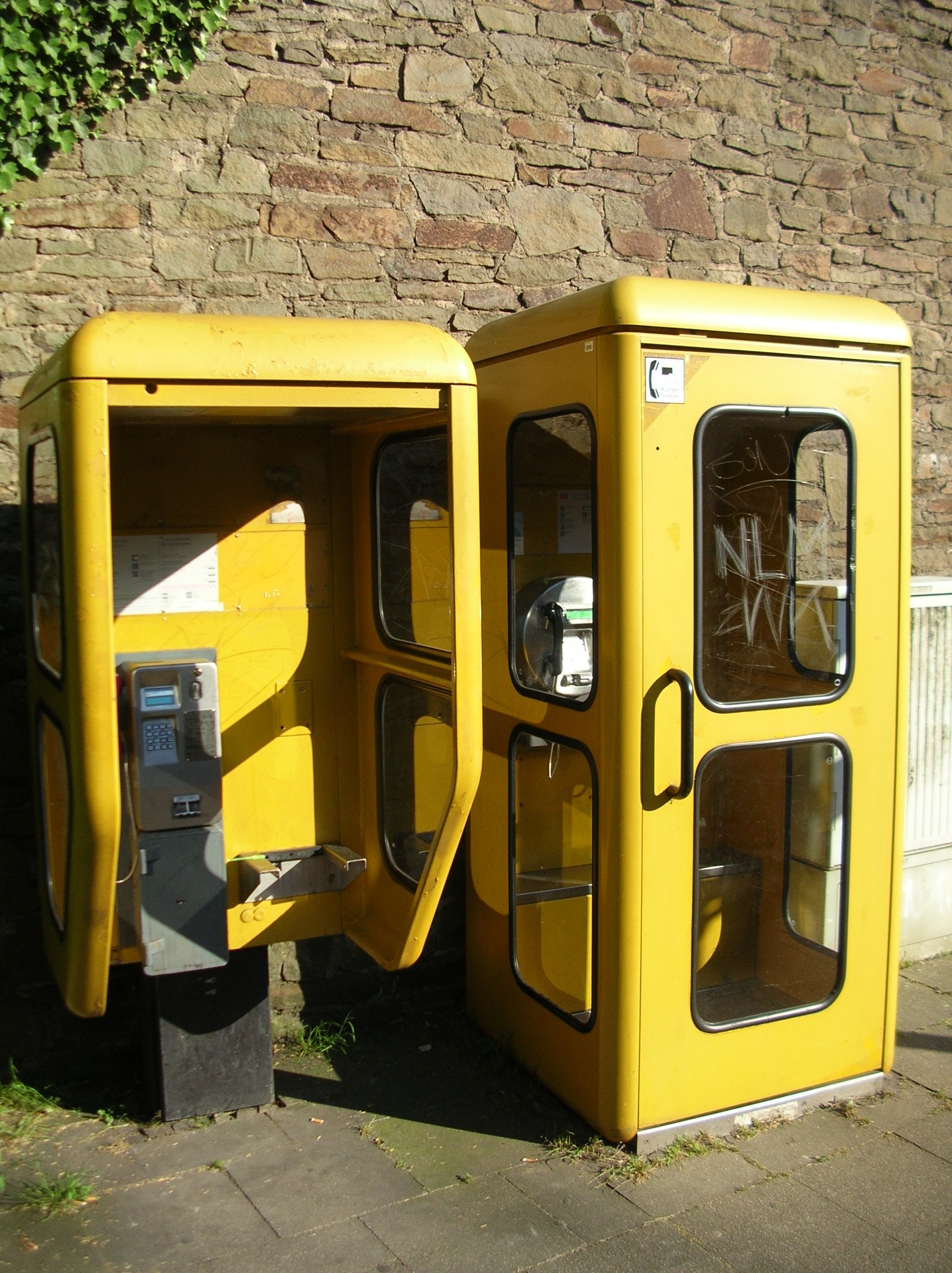 Links eine Telefonhaube TelHb82, auch für Rollstuhlfahrer geeignet, rechts ein Telefonhäuschen TelH78 aus Zeiten der Deutschen Bundespost