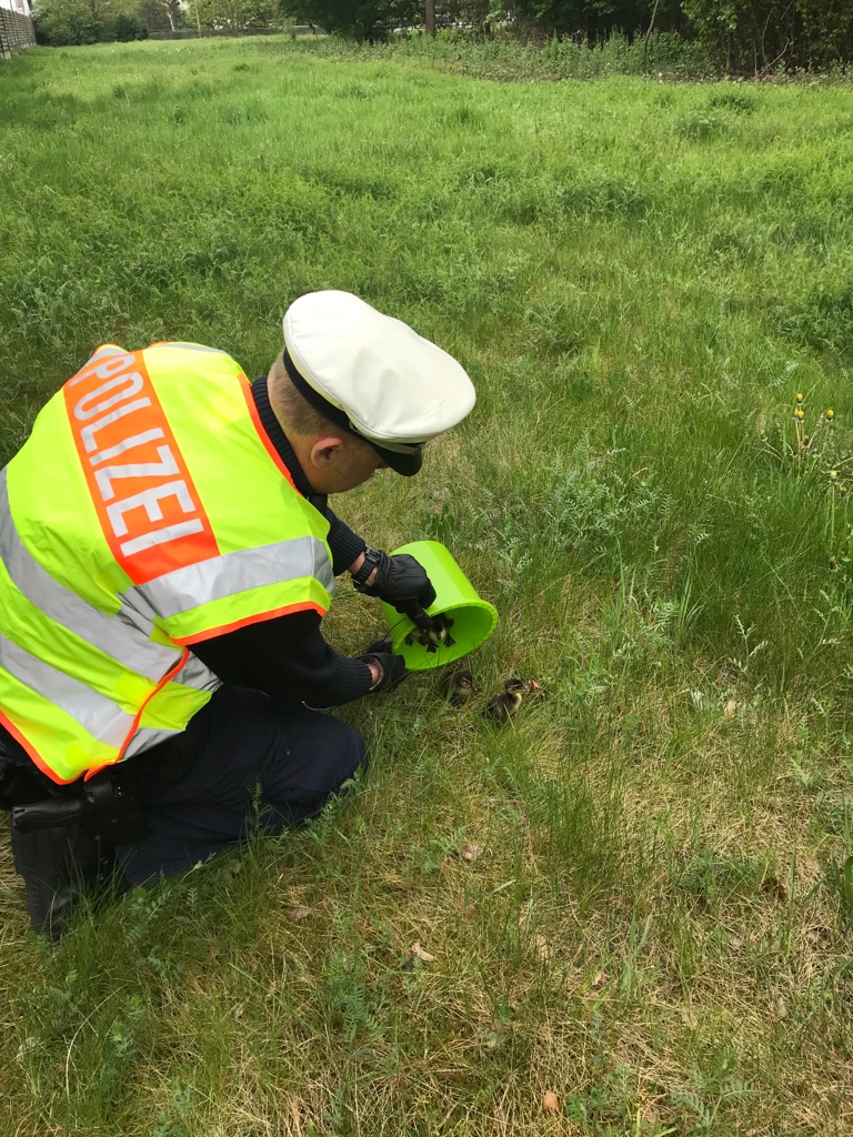 Die Entenküken werden auf einer Grünfläche in die Freiheit entlassen.