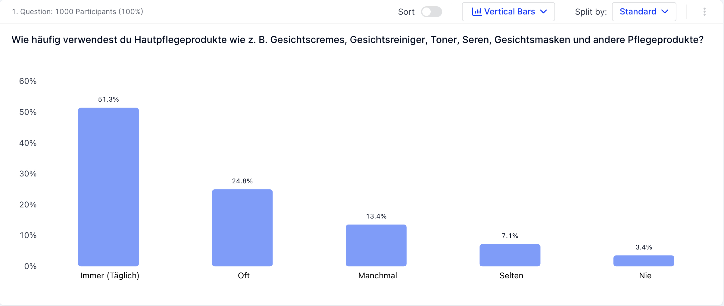 Die Darstellung zeigt eine Grafik zu der Frage "Wie häufig verwendest du Hautpflegeprodukte wie z. B. Gesichtscremes, Gesichtsreiniger, Toner, Seren, Gesichtsmasken und andere Pflegeprodukte?". 51 Prozent der Deutschen benutzen Hautpflegeprodukte täglich, weitere 25 Prozent geben "oft" an und nur drei Prozent antworten mit "nie".