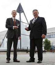 Dr. Robert Hartel (re.) und Dr. Andreas Buske vor der Kristallglas Pyramide Zwiesel. Bild: Zwiesel Kristallglas AG