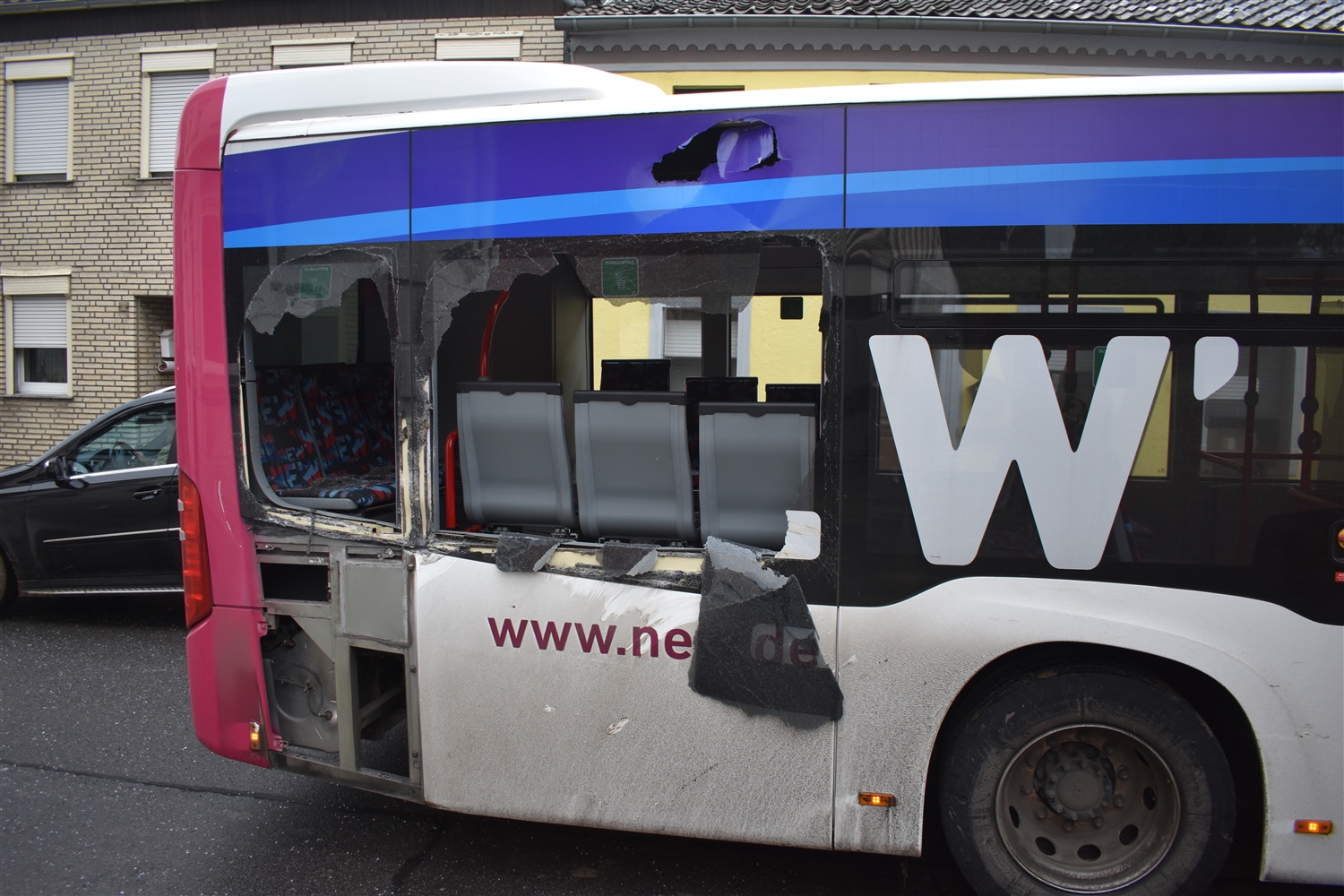 Seitenansicht vom Heck des beschädigten Busses. Bild: Polizei