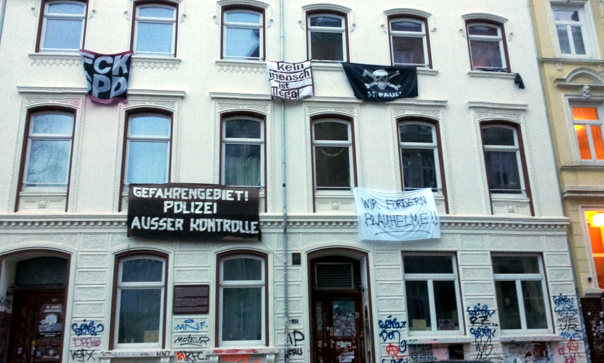 Transparente an einem Wohnhaus in St. Pauli, Proteste gegen das ausgerufene Gefahrengebiet im Januar 2014