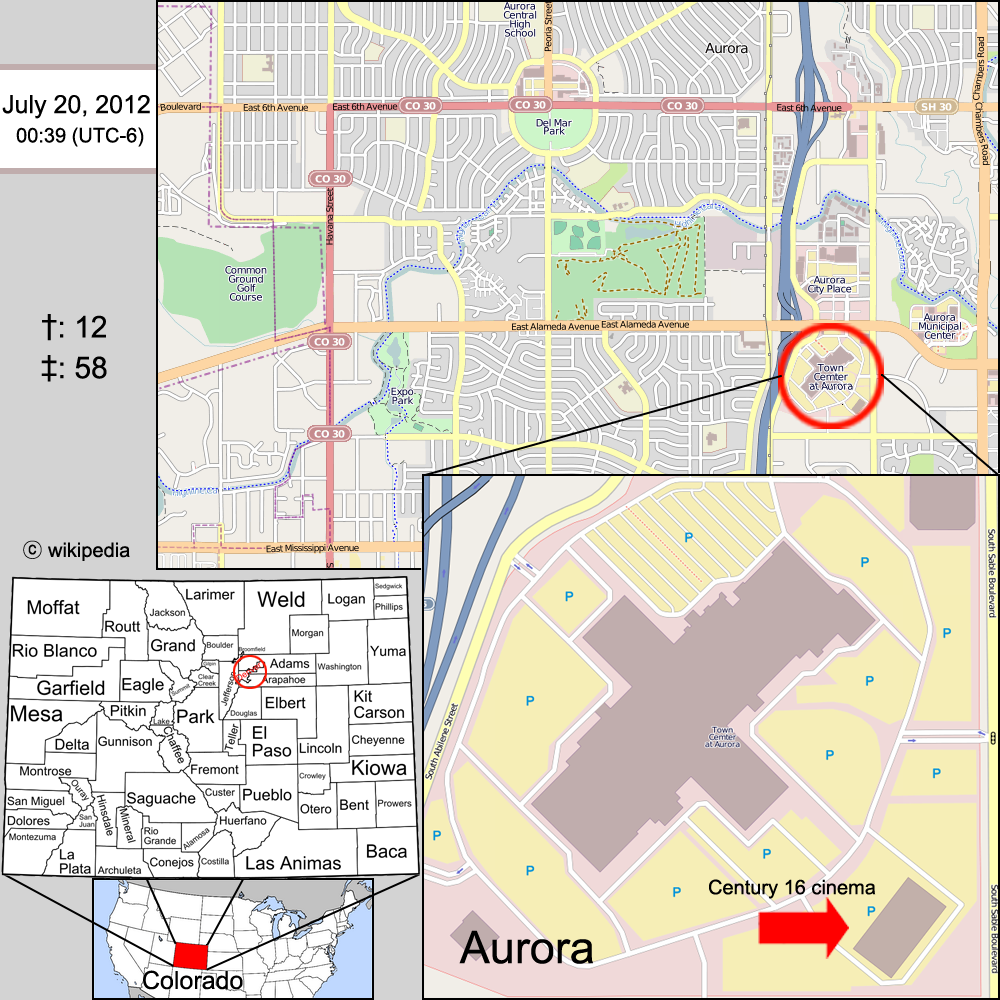 Unten links: Karte von Colorado, Aurora ist auf der Karte markiertOben: Karte von AuroraUnten rechts: Position des Tatorts im Einkaufszentrum „Town Center at Aurora“