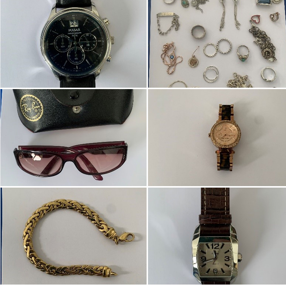 Collage aus sechs Bildern mit Sonnenbrille, Uhren, Goldkette, Modeschmuck Bild Polizei