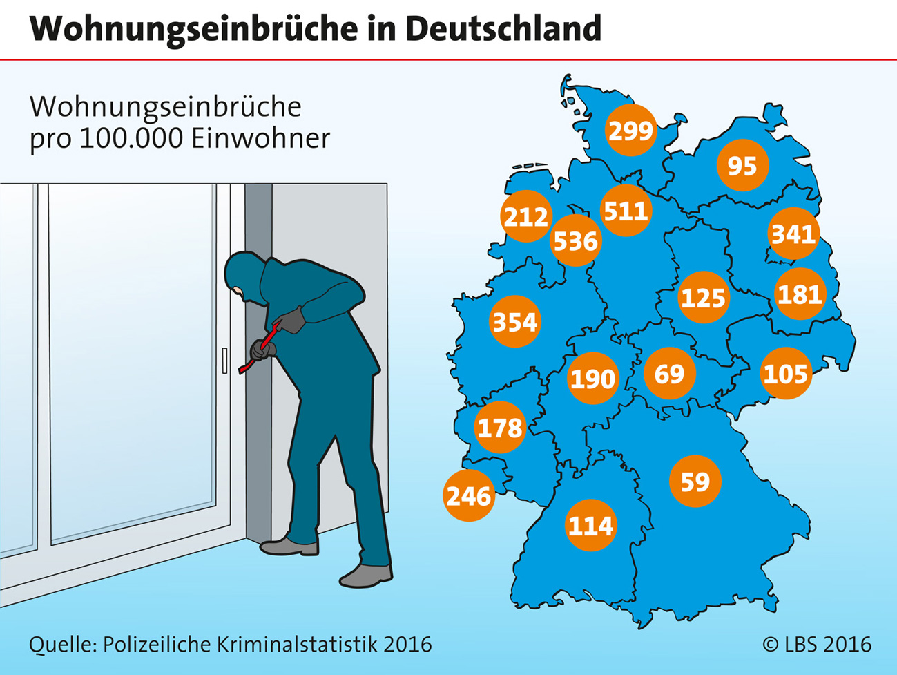 Wohnungseinbrüche in Deutschland / Bild: "obs/LBS Infodienst Bauen und Finanzieren/LBS_Infodienst_Grafik_6_2016"