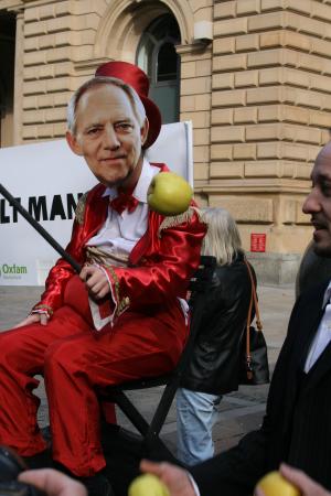 Mit Essen spielt man nicht! Oxfam fordert mehr Regulation an den Börsen. | Schluss mit dem Zirkus. Spekulation mit Nahrungsmitteln gefährdet Menschenleben. Bild: Kay Schulze