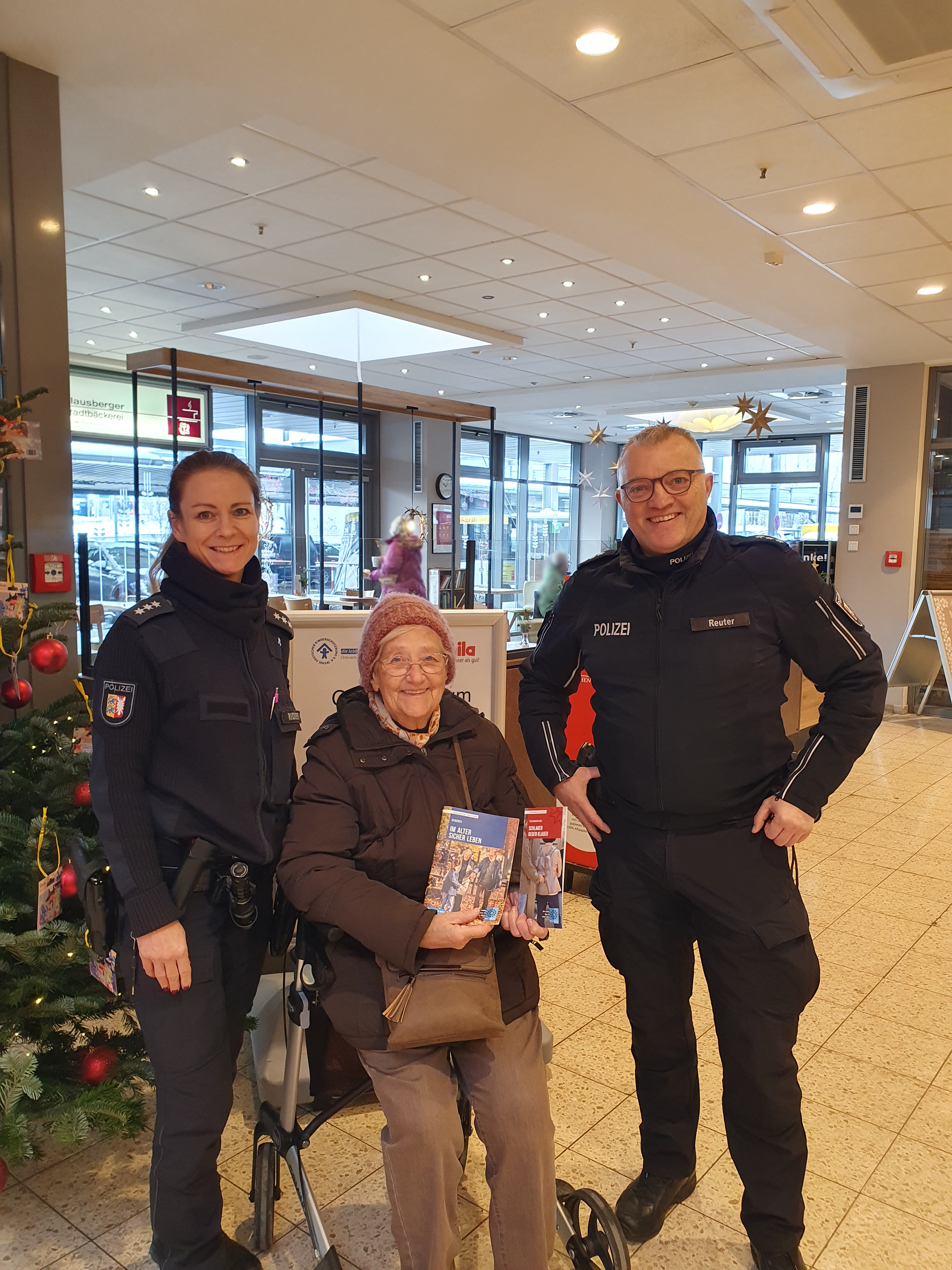 Polizeihauptkommissarin Rabea Ridders (li) und Polizeihauptkommissar Wolfram Reuter (re) vom Polizeirevier Eutin zusammen mit einer Seniorin, die sich sehr über die Info-Broschüren freute. Bild: Polizei